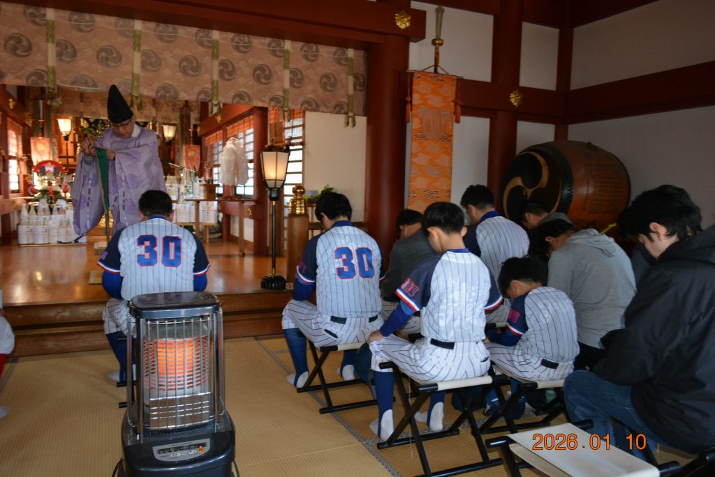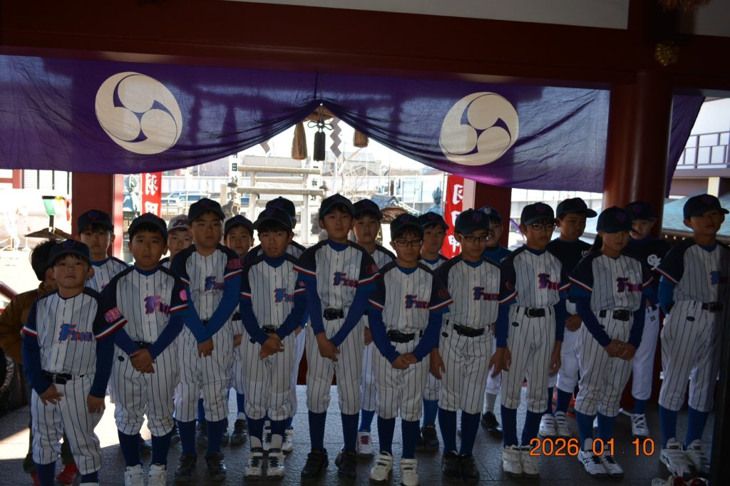 冷たく澄んだ空気の中、選手、指導者、保護者が揃って参拝。 神主様に御祈祷をしていただき、チームの必勝と、何より選手全員が怪我なく一年間野球を楽しめるよう、心を一つに祈願してきました。